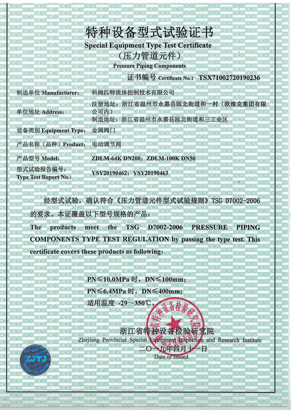 特種設(shè)備型式試驗(yàn)證書(電動調(diào)...