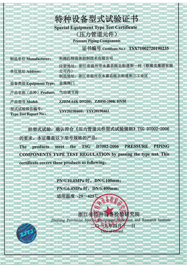 特種設(shè)備型式試驗(yàn)證書(氣動調(diào)...